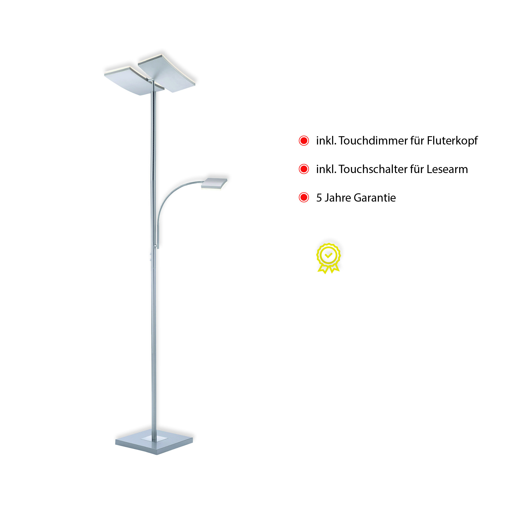 · inkl. Touchdimmer für Fluterkopf, inkl. Touchschalter für Lesearm· LED mit ca. 25.000 Std. Brenndauer· dimmbar über Touchdimmer· Schalter, Touchschalter· Farbe: Silber· Material: Alu, Eisen, Stahl & Metall· Kabellänge: 200 cm· Höhe ca. 196 cmDie LED Stehleuchte RUBEN überzeugt mit einem modernen Design. Der eckige LED Deckenfluter besitzt zwei verschiedene Lichtquellen, die man je nach Bedarf getrennt voneinander schalten kann. Der Fluterkopf ist mit zwei LED Leuchtmitteln bestückt, die zwei eckigen Spots sind beweglich und können unterschiedlich verstellt werden. Über einen Touchdimmer kann man die Lichtintensität ganz nach Belieben regulieren. Die Lichtquelle des Lesearms ist mit einem flexiblen Gelenk ausgestattet, welches es ermöglicht, das Leselicht so auszurichten wo und wie es benötigt wird. Die Leuchtmittel haben alle eine Farbtemperatur von 3000 Kelvin und geben so ein angenehm, wohnliches Licht wieder. Der Fluter eignet sich hervorragend als zusätzliches Licht in Wohn- und Schlafräumen und wird garantiert auch einen besonderen Platz in Ihren Wohnräumen finden.