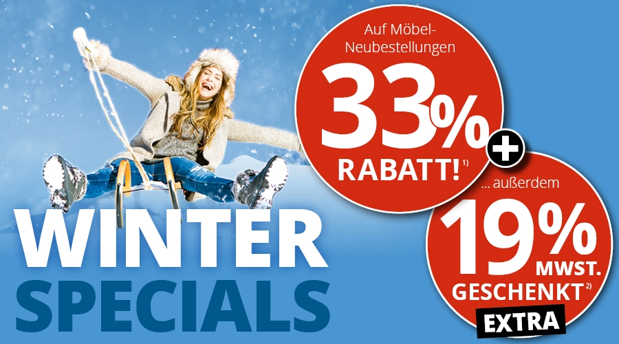 Wenn es draußen kalt wird, sorgen wir drinnen für besondere Angebote. Freuen Sie sich auf unsere Winter Specials mit 33 % auf Möbel-Neubestellungen – plus 19 % MwSt. geschenkt extra obendrauf. Entdecken Sie neue Wohn-Inspirationen, starke Marken und attraktive Angebote in vielen Abteilungen.