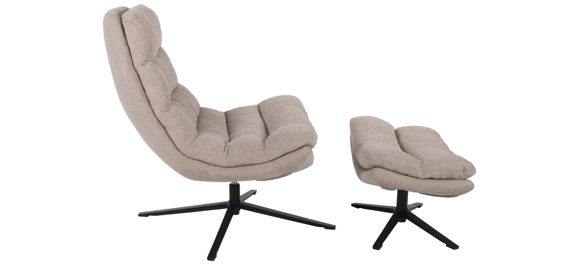Entdecke den Komfort des Relaxsessels mit Hocker. Mit einer Belastbarkeit von ca. 115 kg bietet der Sessel eine stabile und langlebige Sitzgelegenheit. Die Sitzhöhe und der Webstoff in der Farbe Sand sorgen für optimalen Komfort und stilvolle Eleganz. Das Fußkreuz aus schwarzem Metall verleiht dem Sessel eine moderne Optik, während der Sitz aus Schaumstoff und Gummigurten höchsten Sitzkomfort garantiert. Perfekt für entspannte Stunden in deinem Zuhause. Ohne Dekoration.